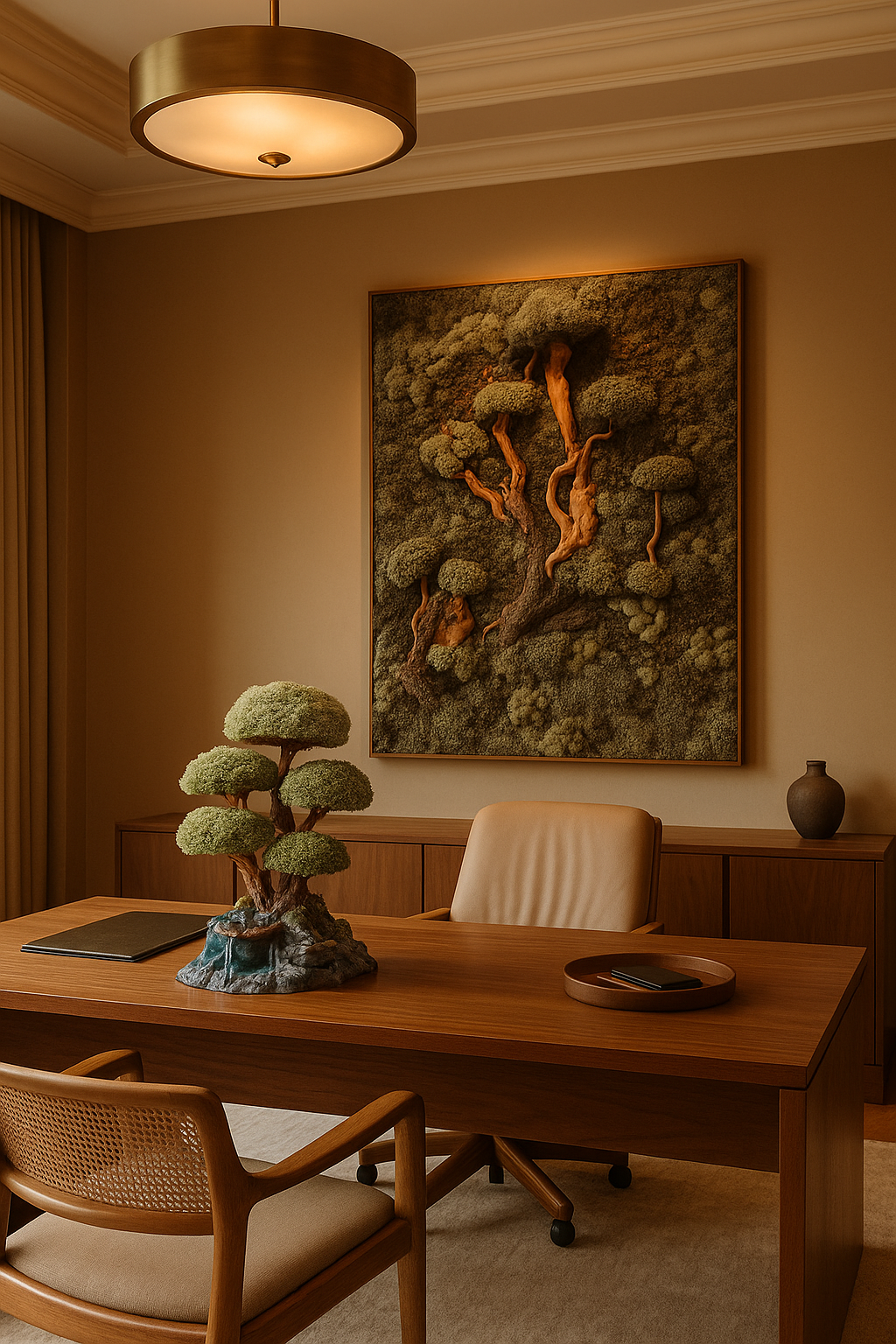 В гостиной — другое настроение. Здесь мох превращается в арт-объект. Панно можно вписать в нишу, над диваном или даже в галерею рядом с картинами.