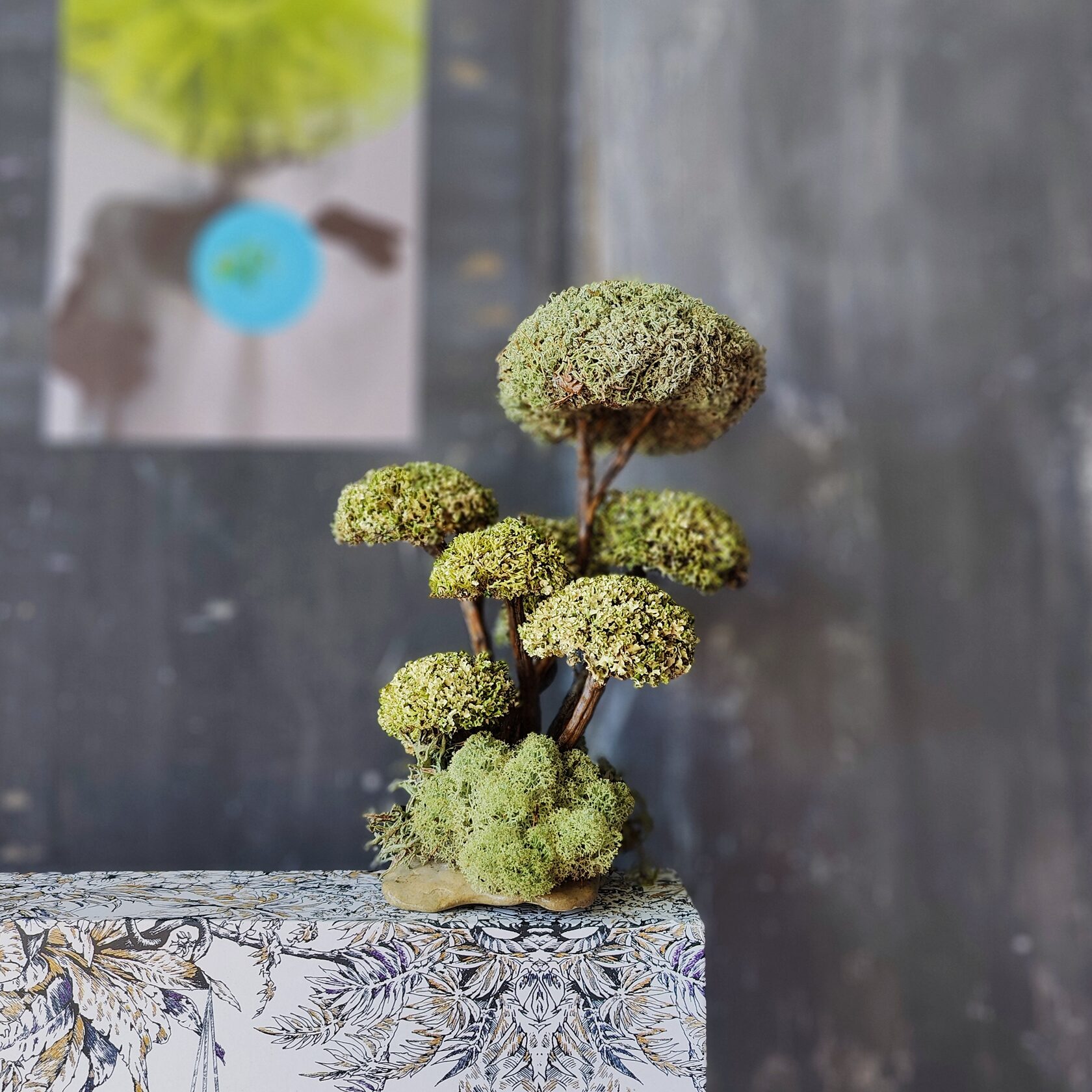 Первое, что стоит рассмотреть — декоративное дерево из мха цетрария. Оно не вянет. Не просит воды. Оно просто стоит — и приносит покой.
